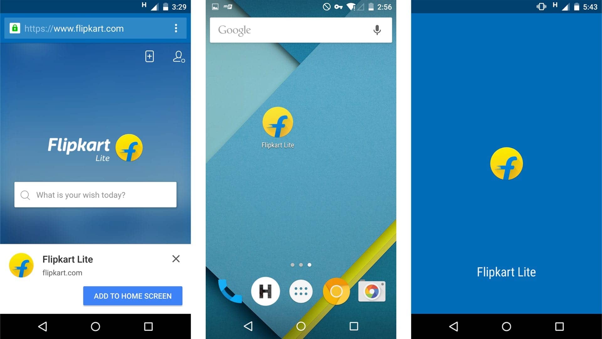 当浏览器发现用户需要 Flipkart Lite 时,它就会提示用户「嘿,你可以把它添加至主屏哦」(用户也可以手动添加)。这样,Flipkart Lite 就会像原生应用一样在主屏上留下一个自定义的 icon 作为入口;与一般的书签不同,当用户点击 icon 时,Flipkat Lite 将直接全屏打开,不再受困于浏览器的 UI 中,而且有自己的启动屏效果。