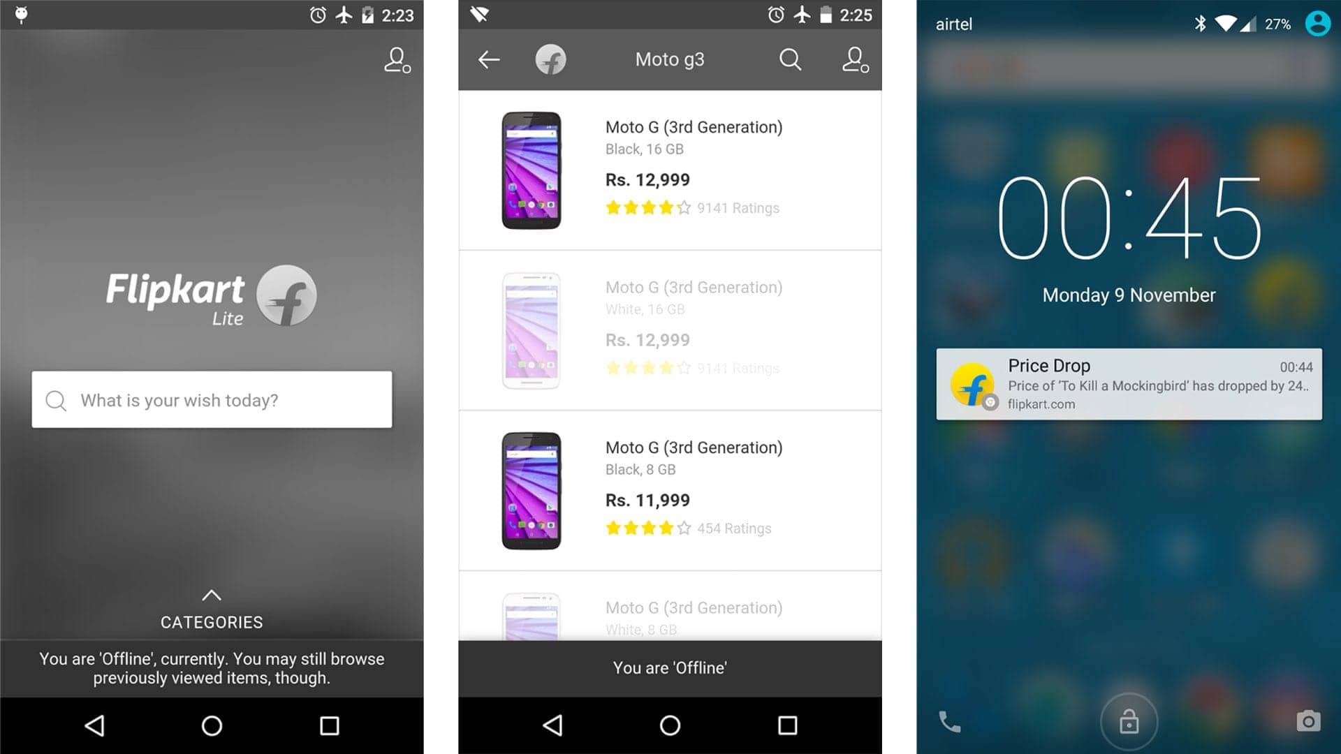 更强大的是,在无法访问网络时,Flipkart Lite 可以像原生应用一样照常执行,还会很骚气的变成黑白色;不但如此,曾经访问过的商品都会被缓存下来得以在离线时继续访问。在商品降价、促销等时刻,Flipkart Lite 会像原生应用一样发起推送通知,吸引用户回到应用。