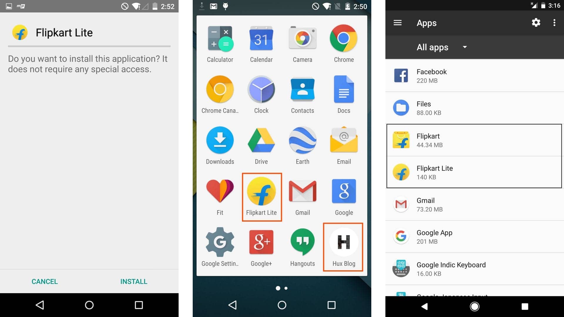 图中从左到右分别为:类似原生应用的安装界面;被收纳在应用抽屉里的 Flipkart Lite 与 Hux Blog;设置界面中并列出现的 Flipkart 原生应用与 Flipkart Lite PWA (可以看到 PWA 巨大的体积优势)