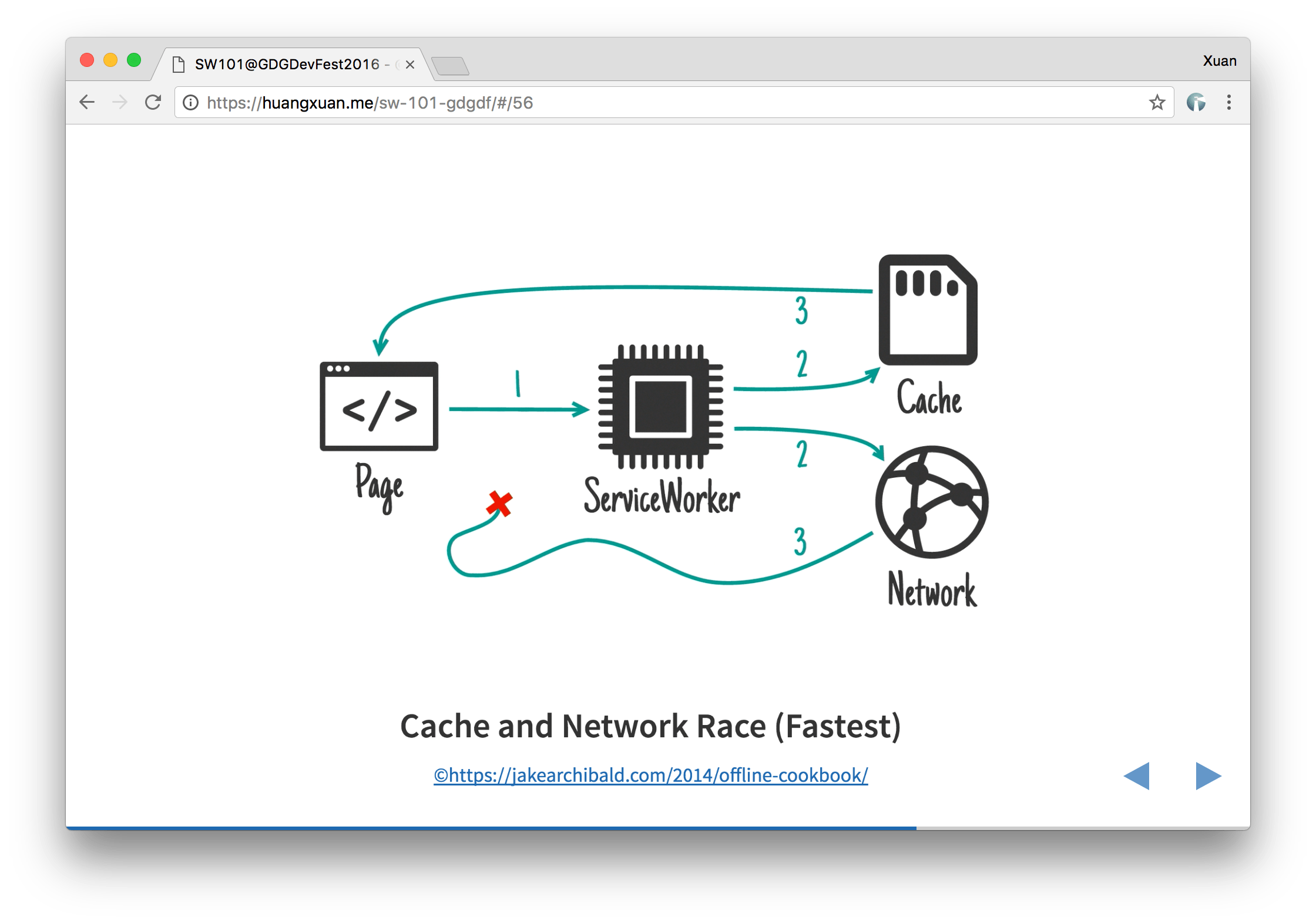 可以看出,Service Worker 被设计为一个相对底层(low-level)、高度可编程、子概念众多,也因此异常灵活且强大的 API,故本文只能展示它的冰山一角。出于安全考虑,注册 Service Worker 要求你的 web 应用部署于 HTTPS 协议下,以免利用 Service Worker 的中间人攻击。笔者在今年 GDG 北京的 DevFest 上分享了 Service Worker 101,涵盖了 Service Worker 譬如「网络优先」、「缓存优先」、「网络与缓存比赛」这些更复杂的缓存策略、学习资料、以及示例代码,可以供大家参考。