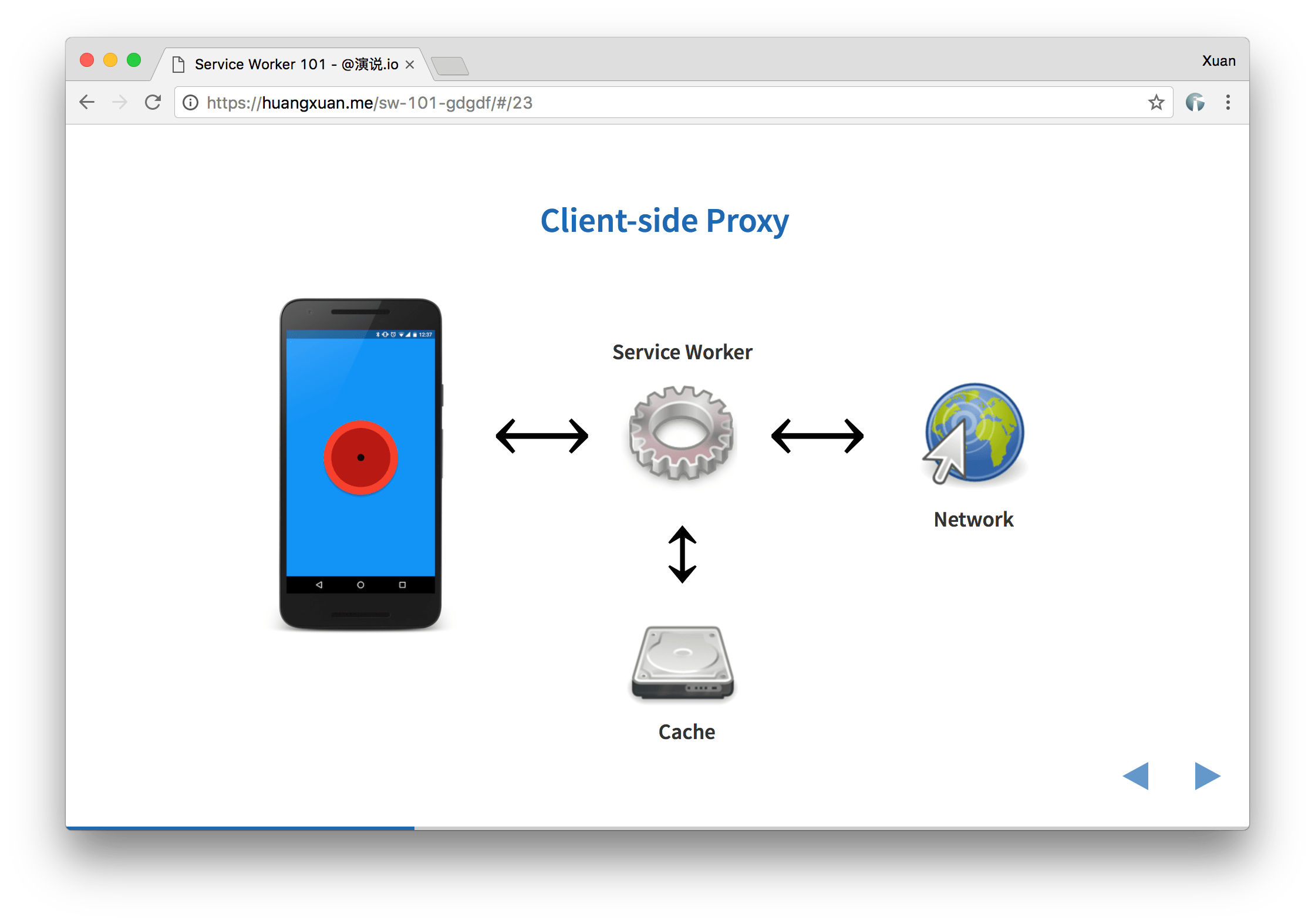时至今日,我们终于迎来了 Service Worker 的曙光。简单来说,Service Worker 是一个可编程的 Web Worker,它就像一个位于浏览器与网络之间的客户端代理,可以拦截、处理、响应流经的 HTTP 请求;配合随之引入 Cache Storage API,你可以自由管理 HTTP 请求文件粒度的缓存,这使得 Service Worker 可以从缓存中向 web 应用提供资源,即使是在离线的环境下。